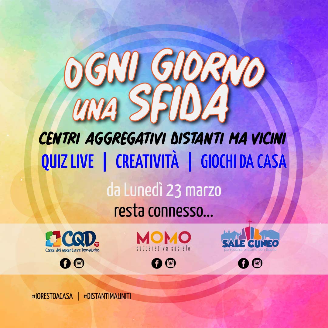 Visto che in queste settimane siamo distanti ognuno nelle proprie case, i Centri Aggregativi dei Sale Cuneo e Casa del Quartiere Donatello e tutti gli spazi aggregativi in cui Momo opera, hanno deciso di unirsi per proporre a bimbi e ragazzi dai 6 ai 14 anni delle proposte di Attività a Distanza.